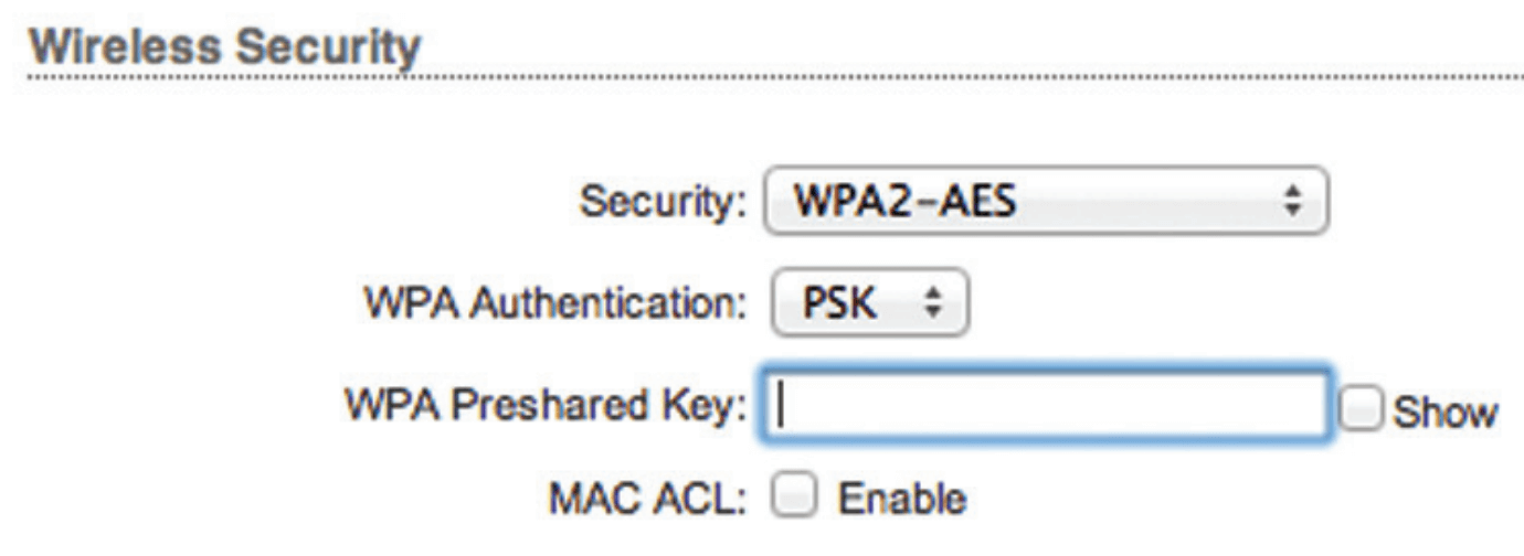 4. Under Wireless Settings, choose WPA2-AES as the Security method.
