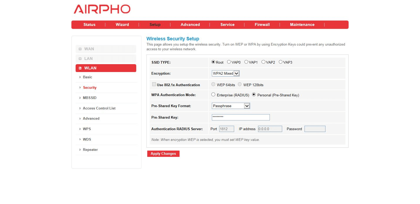 - Enter the Wi-Fi Password in the Pre-Shared Key field and click Apply Changes.