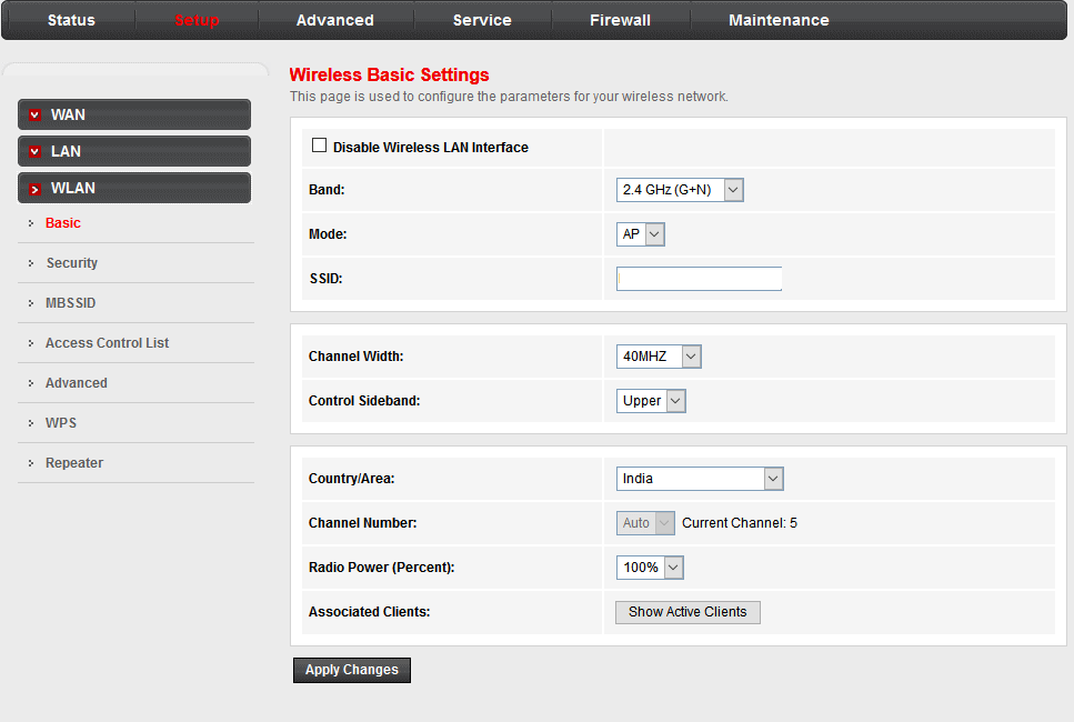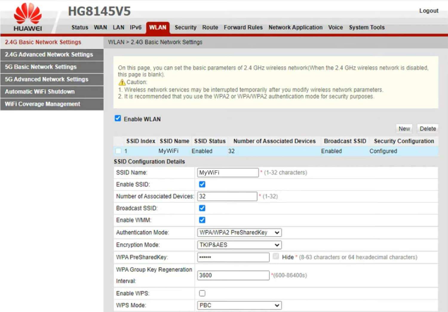 - Choose WLAN from the top menu and select 2.4G Basic Network Settings. To configure 5G settings, select 5G Basic Network Settings.