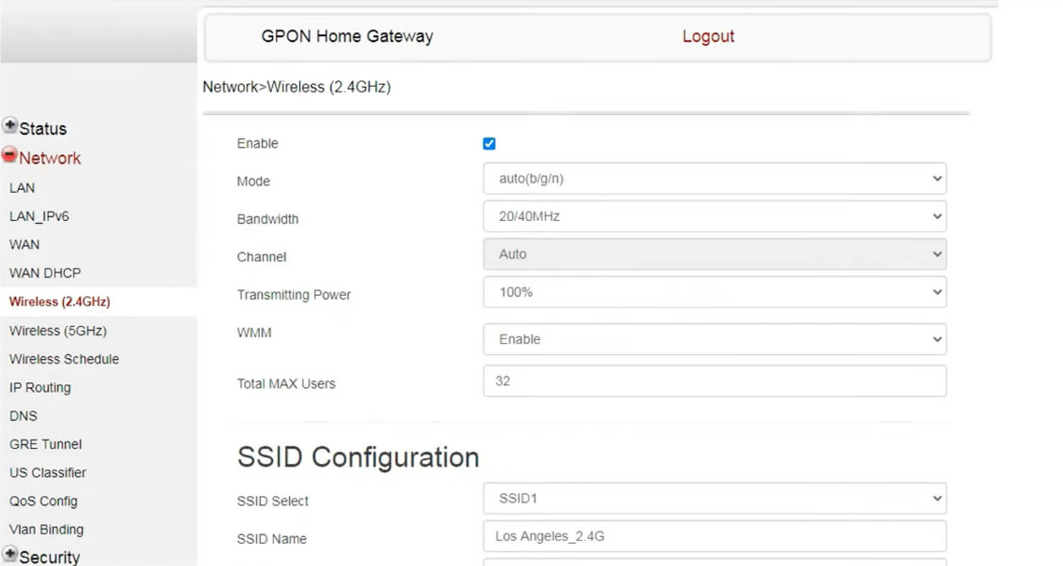 - Click on Network from the menu and choose Wireless (2.4GHz). To make changes to your 5G settings, choose Wireless (5GHz).