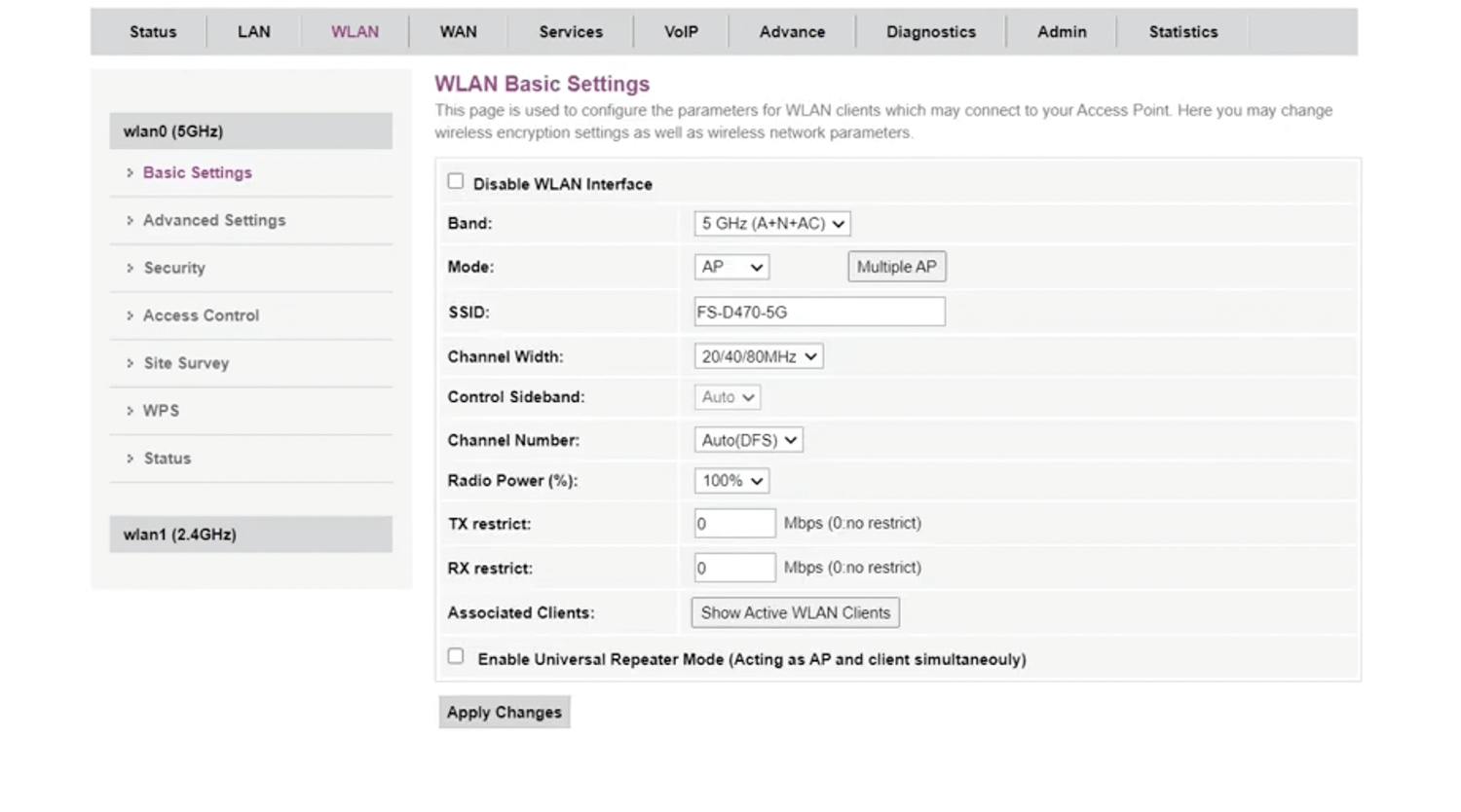 - Select WLAN > wlan0 (5GHz) > Basic Settings.