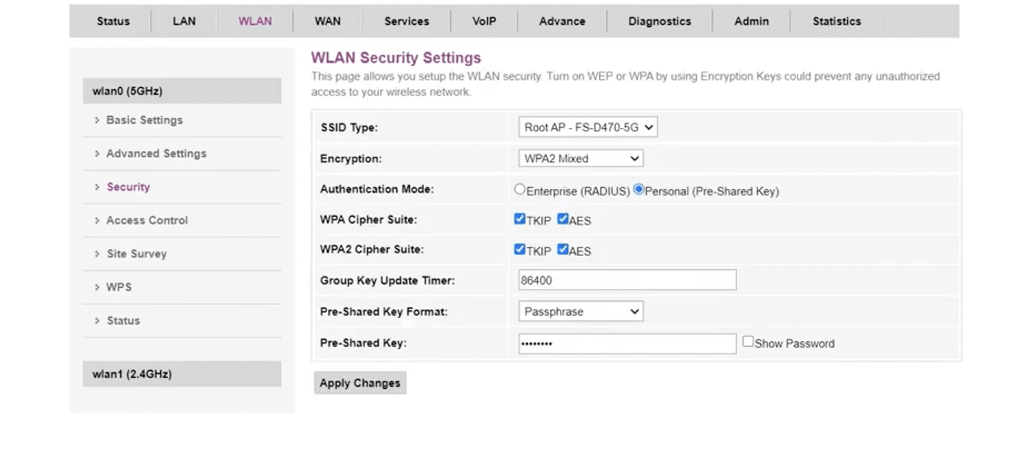 - Enter the Wi-Fi Password in the Pre-Shared Key field and click Apply Changes.