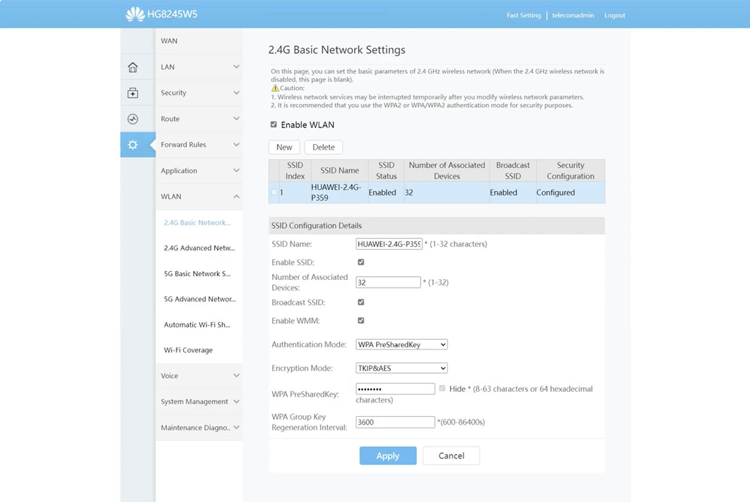 - Select Advanced > WLAN > 2.4G Basic Network Settings.