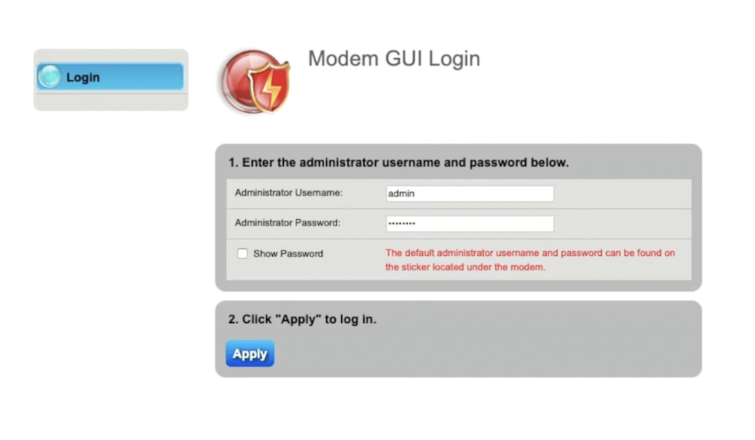 Note: The IP Address, Username, and Password can be found on the sticker located under the modem.