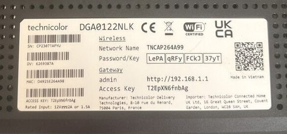 Technicolor DGA0122192.168.1.1admin(Check router's sticker)