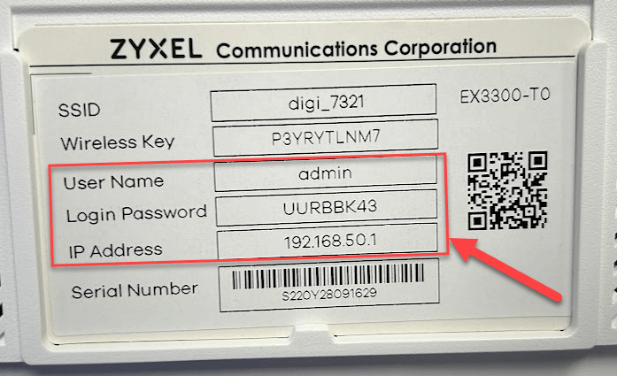 Note: The IP address, Username, and Password can be found on the sticker located under the router.