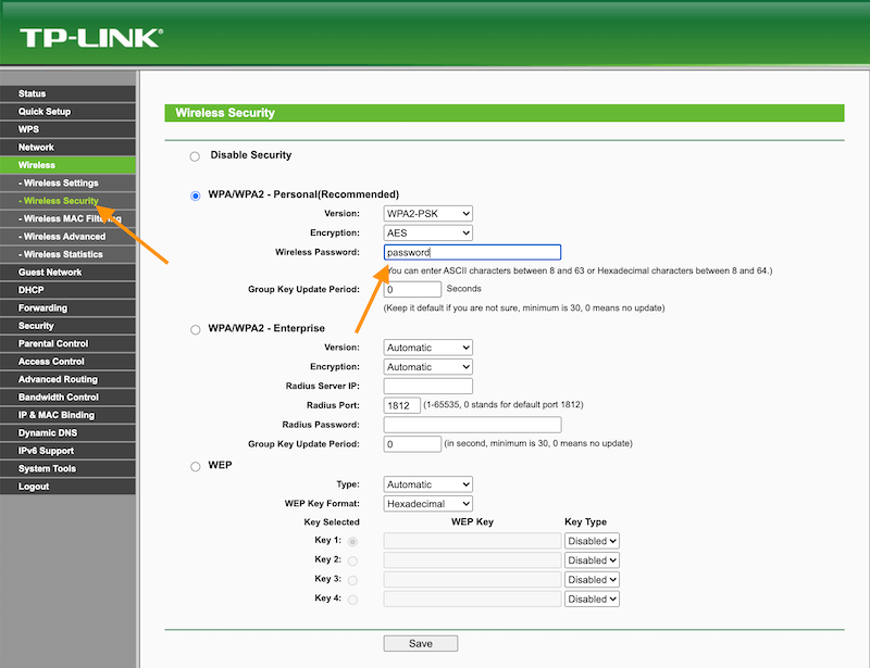 - Once logged in go to “Wireless” > “Wireless Security” settings.