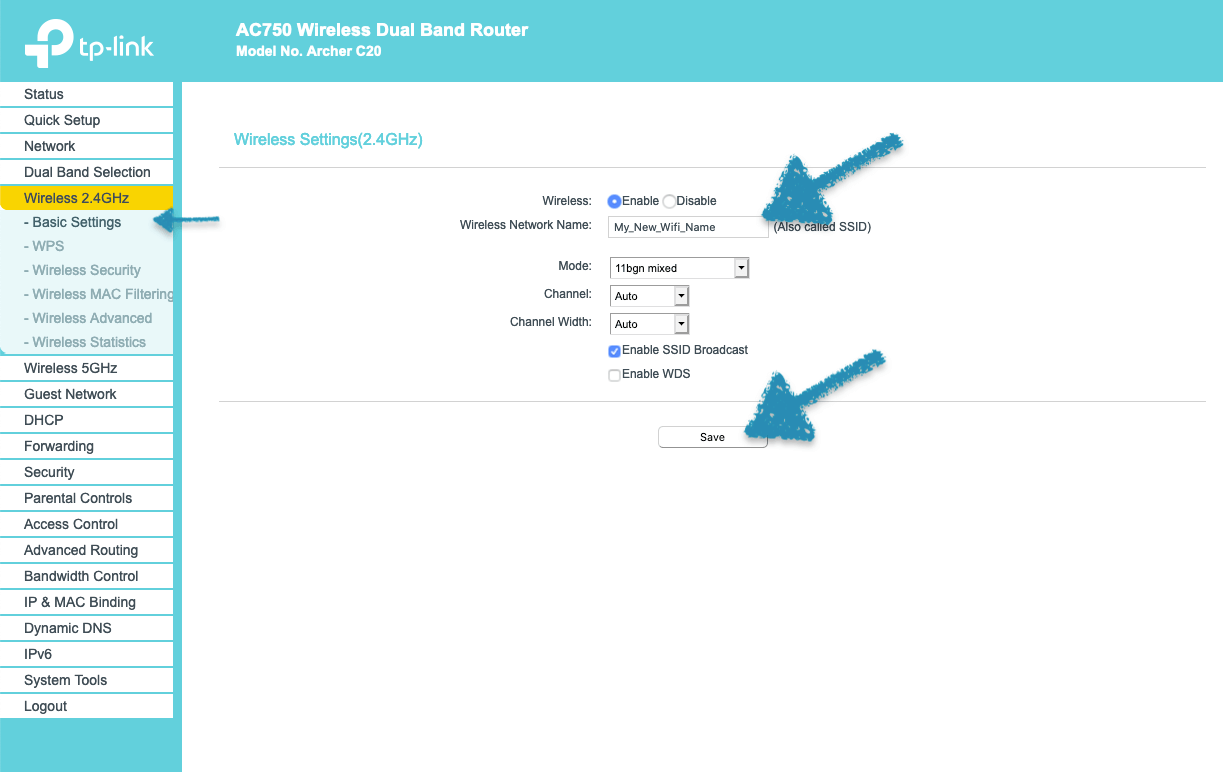 - Select Wireless 2.4GHz > Basic Settings.