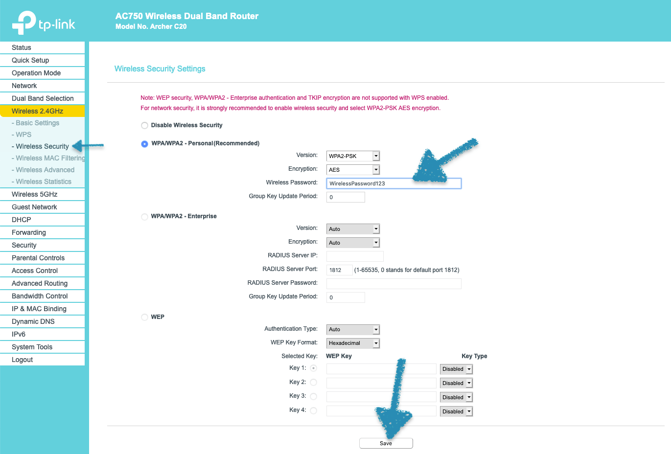 - Enter the Wi-Fi Password in the Wireless Password field and click Save.