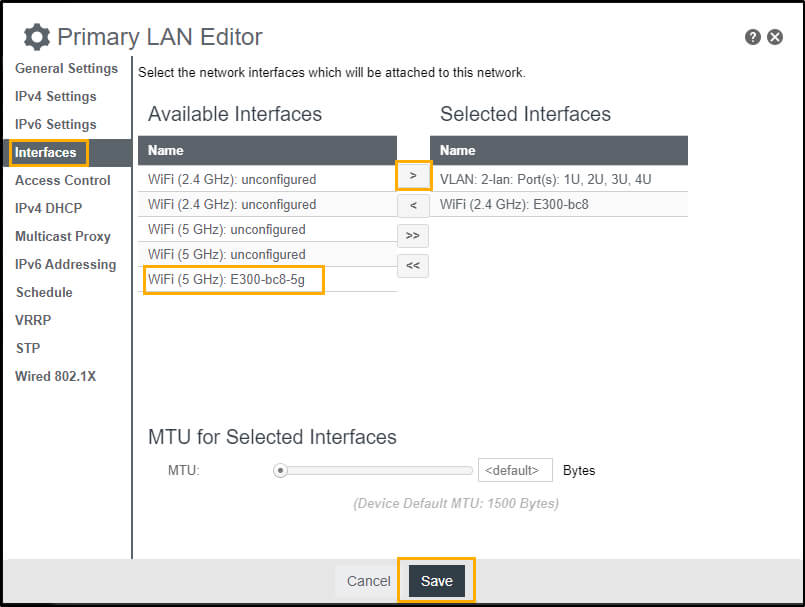 - Select your SSID from Available Interfaces and click the -> button to move the SSID to Selected Interfaces.