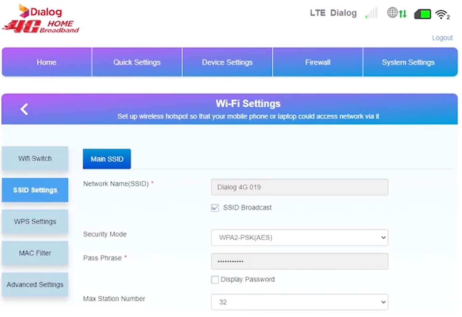 Dialog Admin Portal allows you to change WiFi password, Network Name (SSID), and default Dialog 4G Home Broadband settings at http://192.168.8.1.