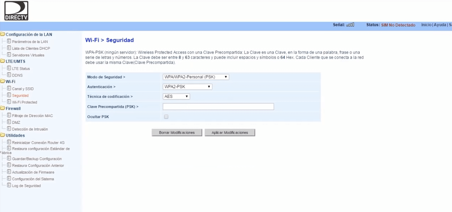 - Enter the Wi-Fi Password in the Clave Precompartida (PSK) field and click Aplicar Modificaciones.