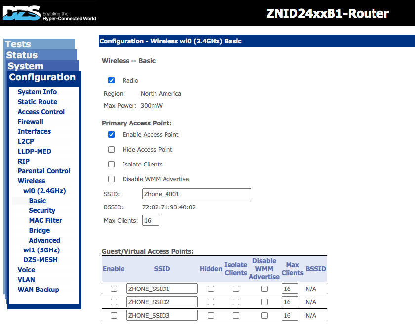 - Select Configuration > Wireless > wl0 (2.4GHz) > Basic.