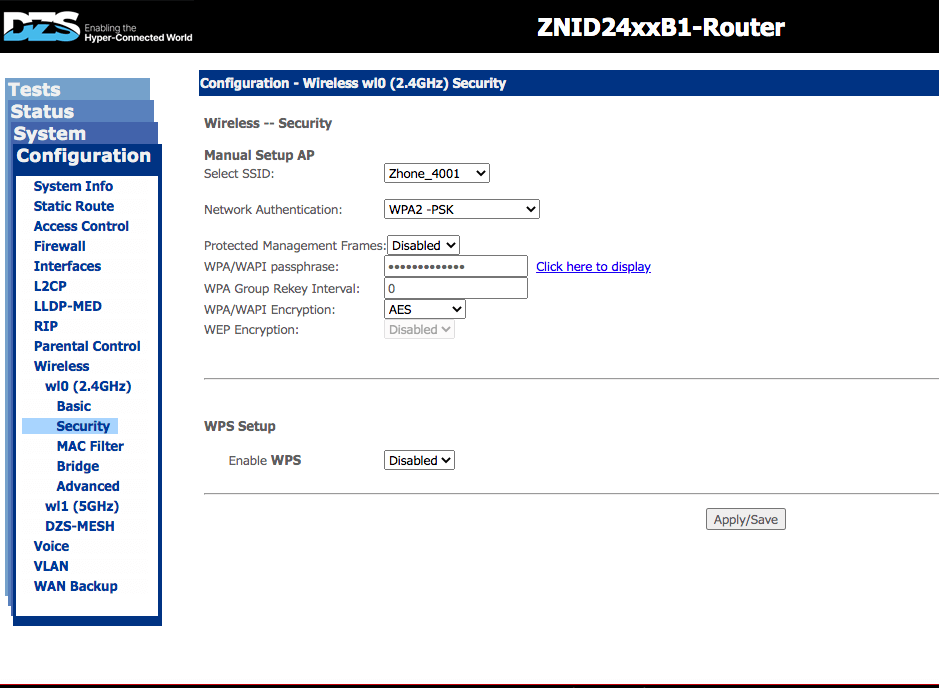 - Select Configuration > Wireless > wl0 (2.4GHz) > Security.