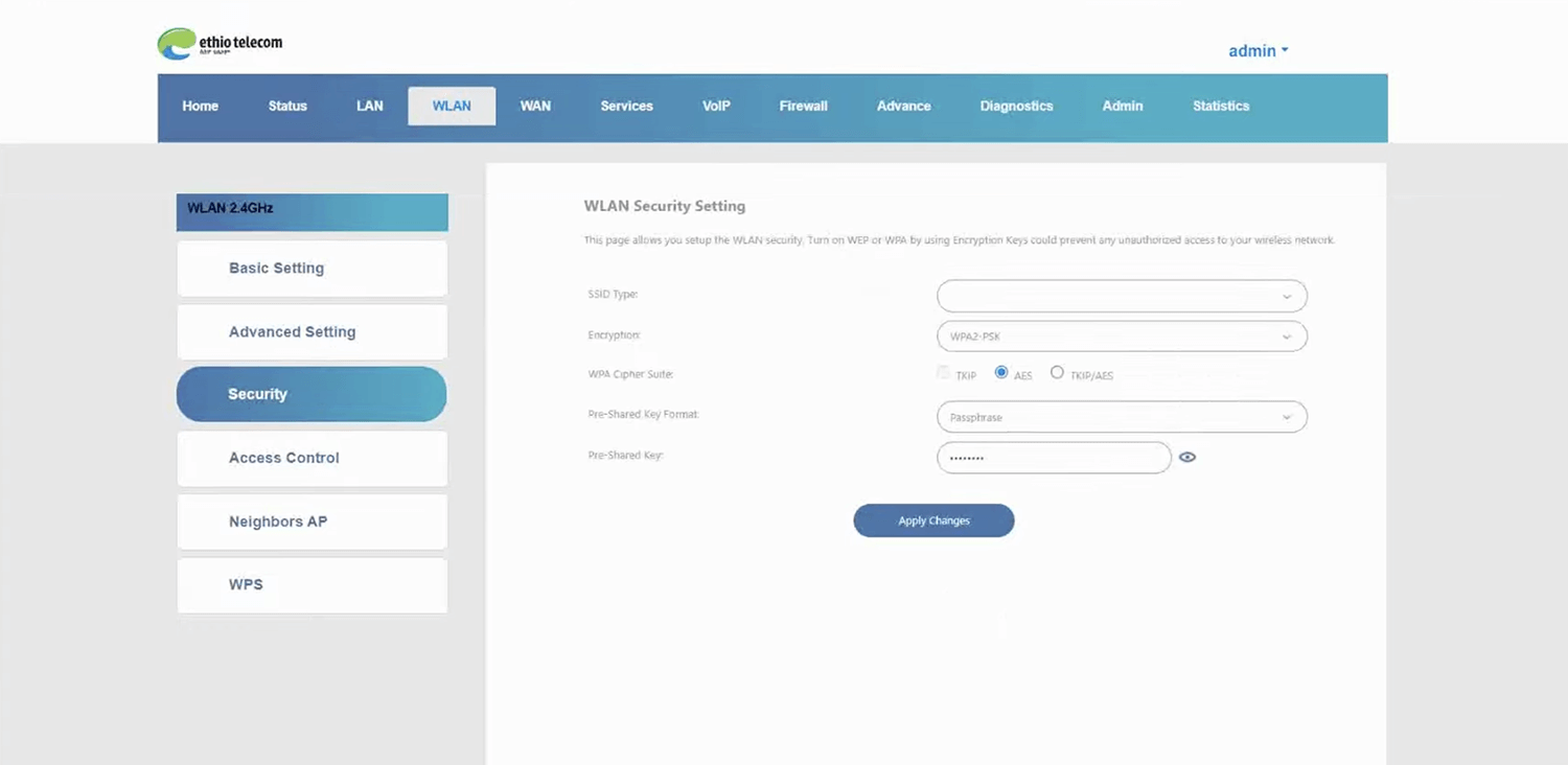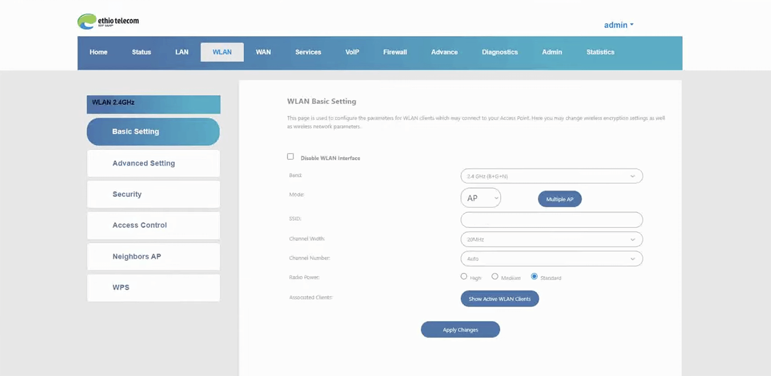 - You will be logged in to the Ethio telecom router settings.