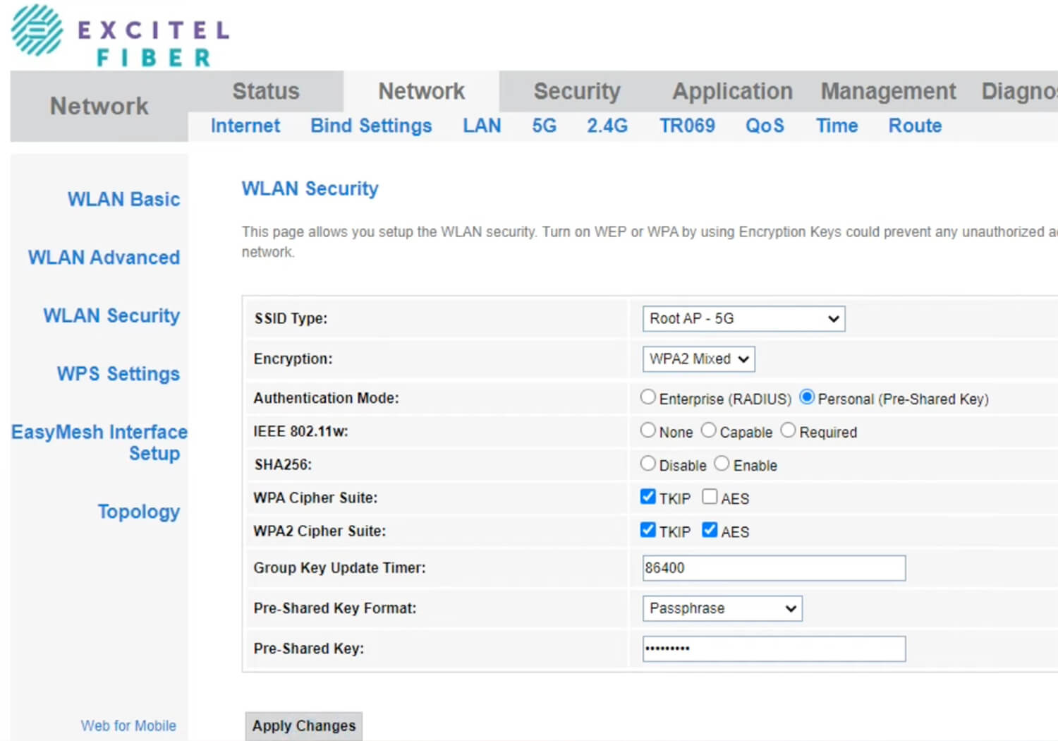 - Enter the Wi-Fi Password in the Pre-Shared Key field and click Apply Changes.