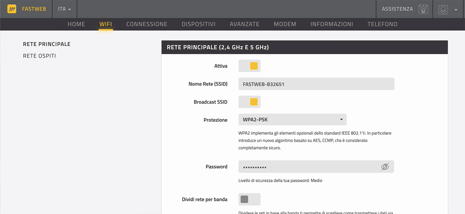 To use 2,4 GHz and 5 GHz Wi-Fi network bands separately, enable the “Dividi rete per banda” option.