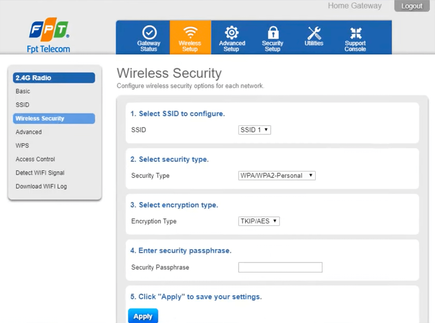 - Go to Wireless Setup > 2.4G Radio > Wireless Security .