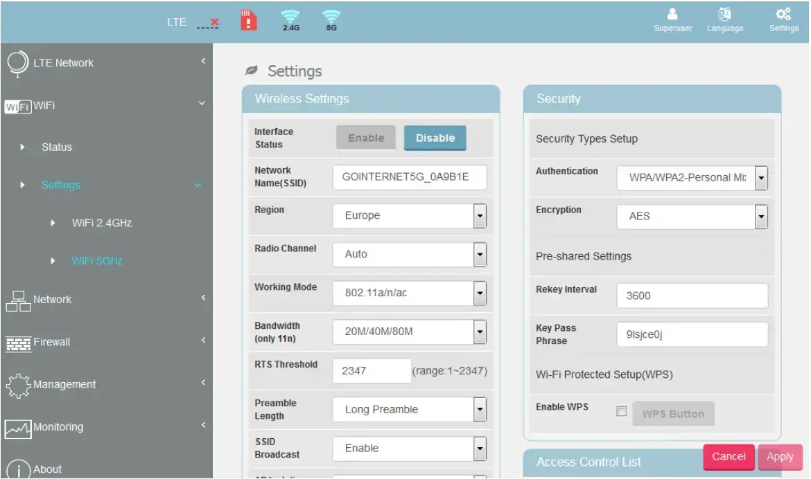- Select WiFi > Settings > WiFi 2.4GHz.