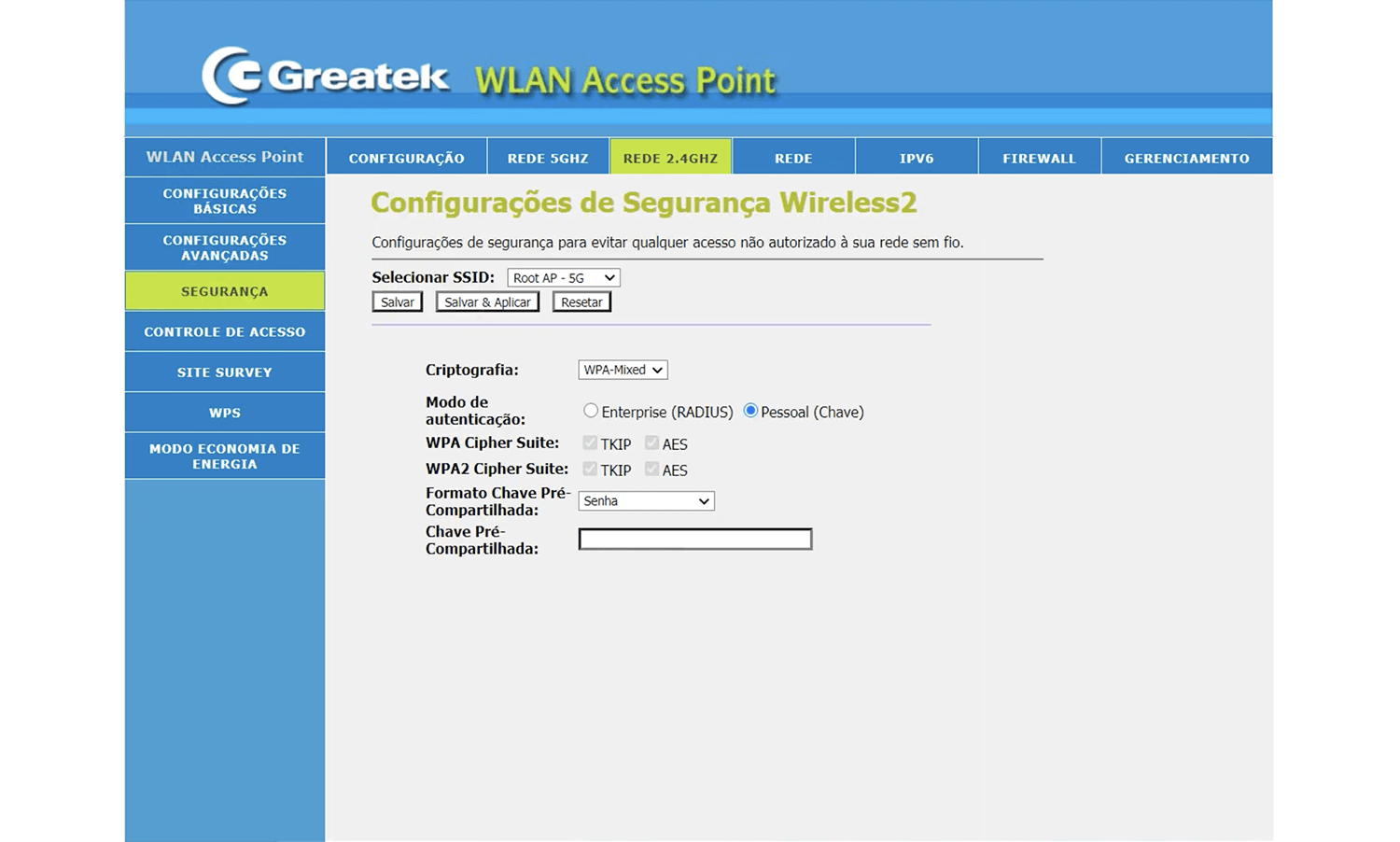 - Enter the Wi-Fi Password in the Chave Pré-Compartilhada field and click Salvar & Aplicar.