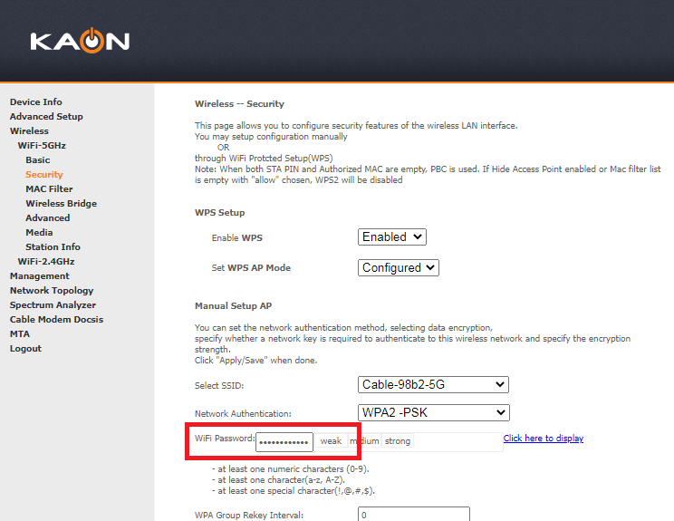 - Wireless > WiFi-5GHz or WIFi-2.4GHz > Security.