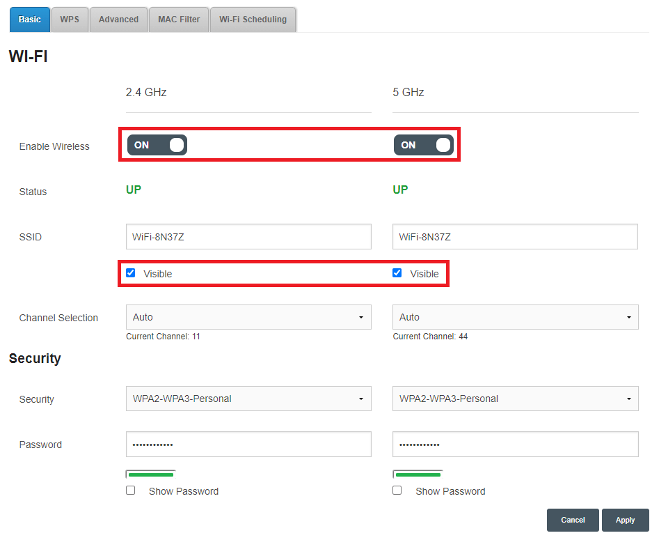 - Wireless > WiFi-5GHz or WIFi-2.4GHz > Basic.