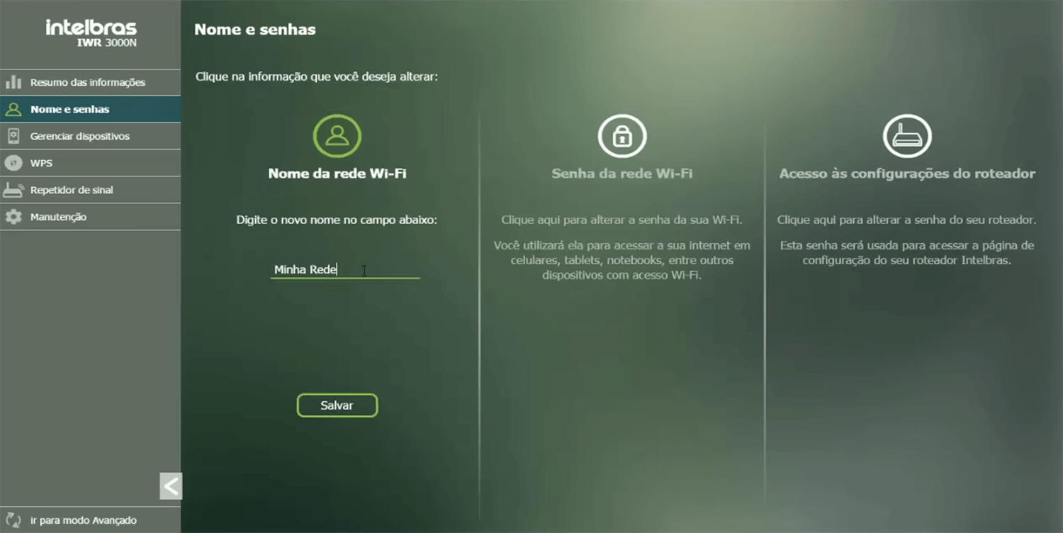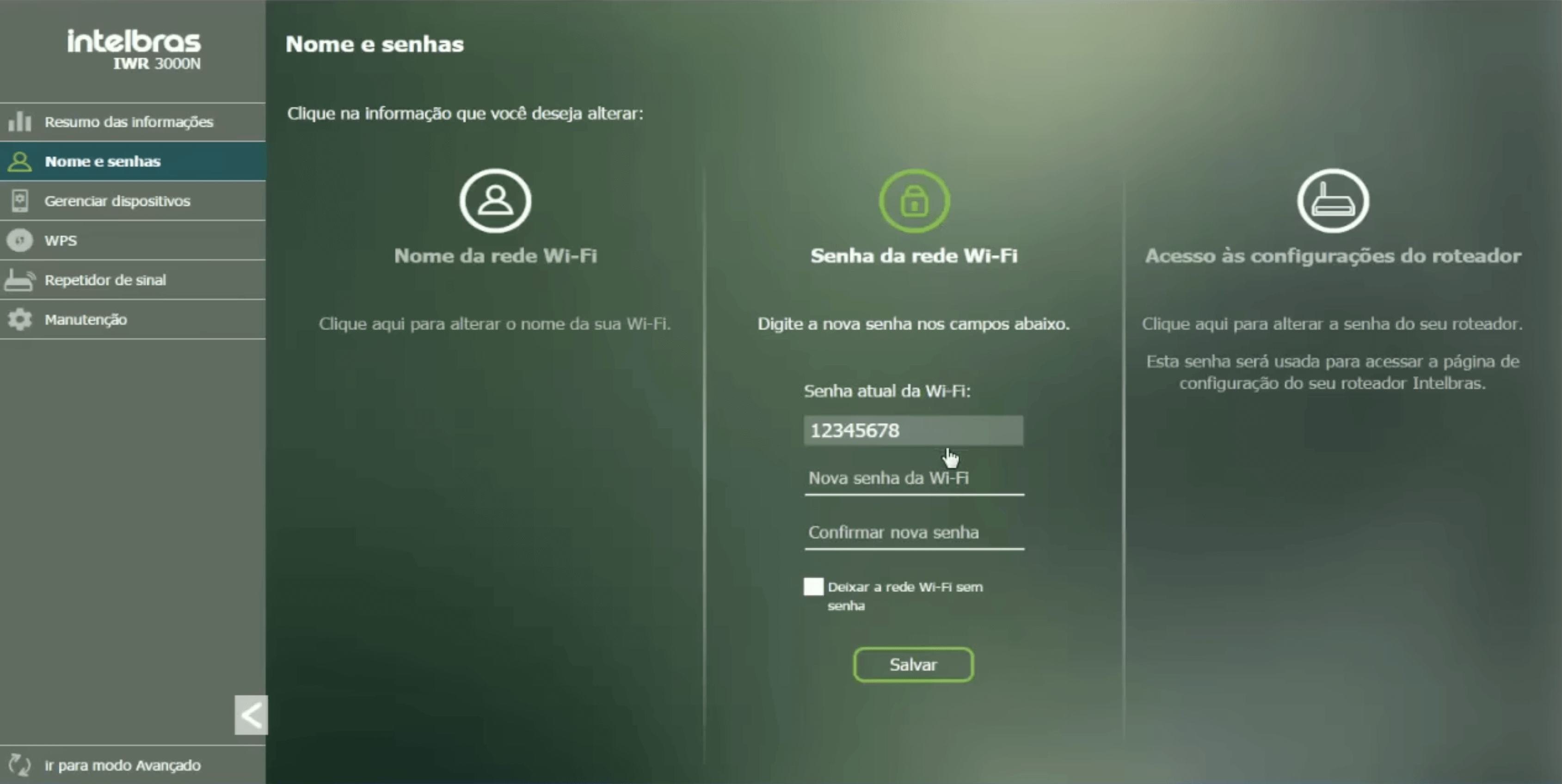 - Enter the Wi-Fi Password in the Nova senha da Wi-Fi field and click Salvar.