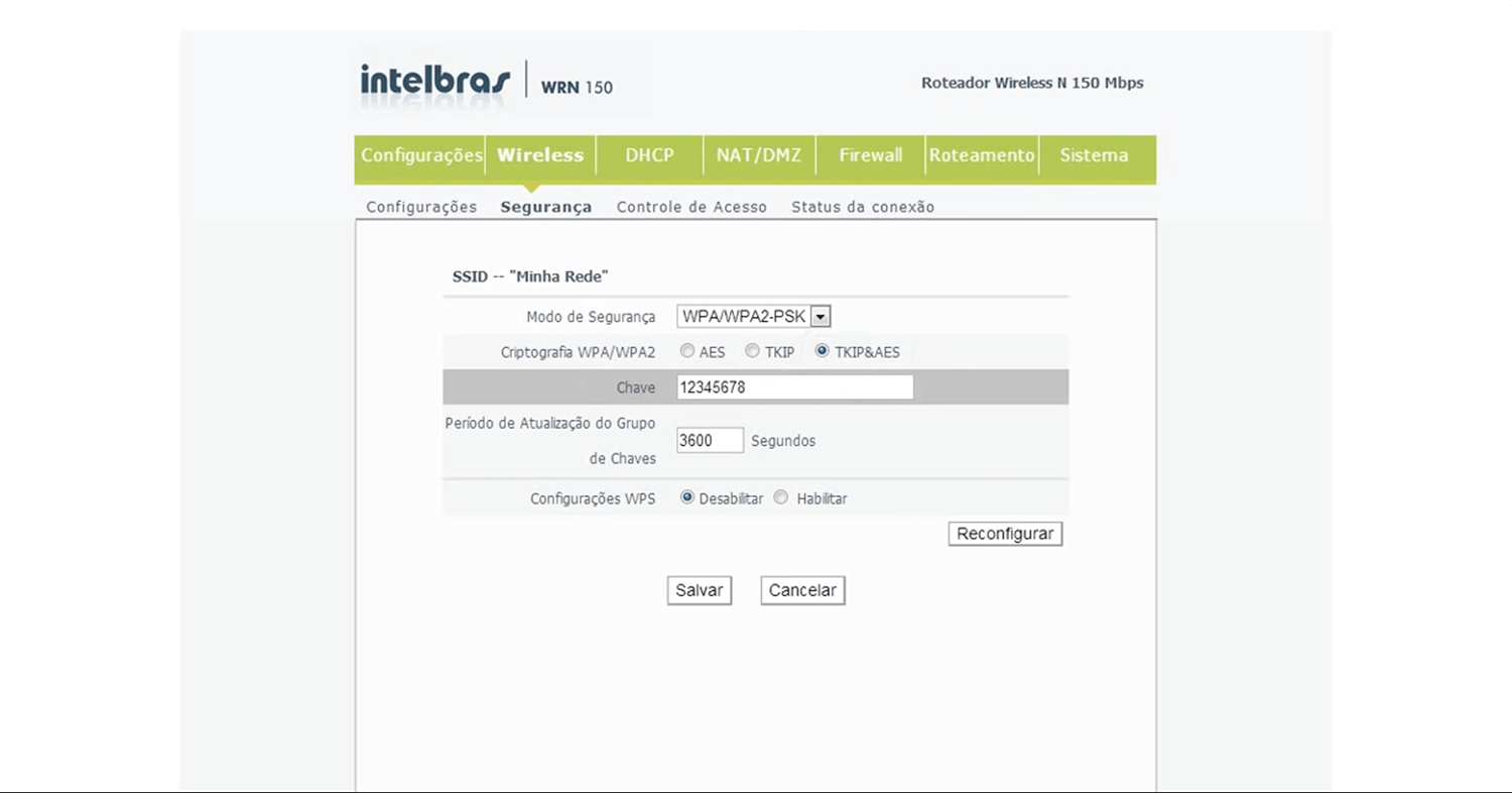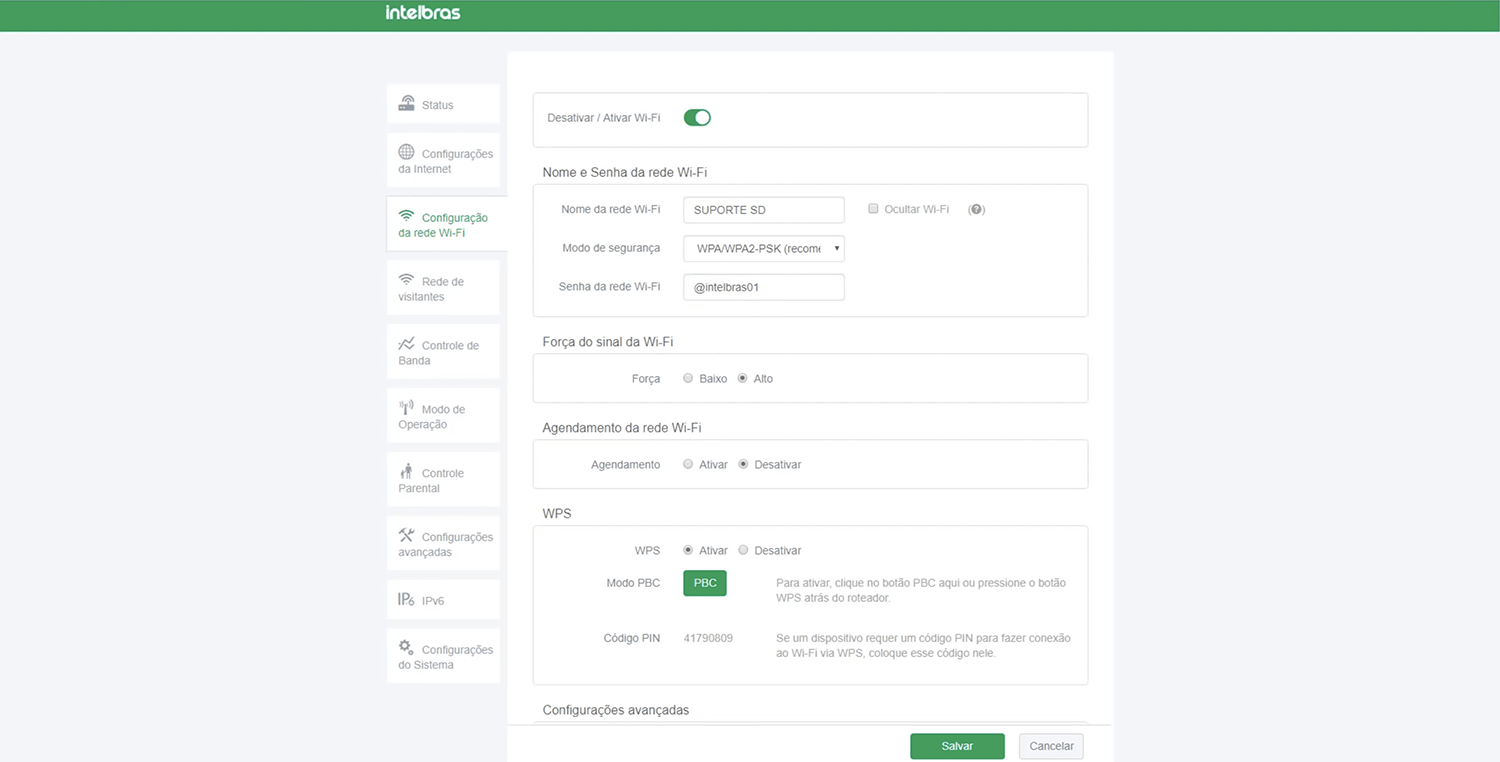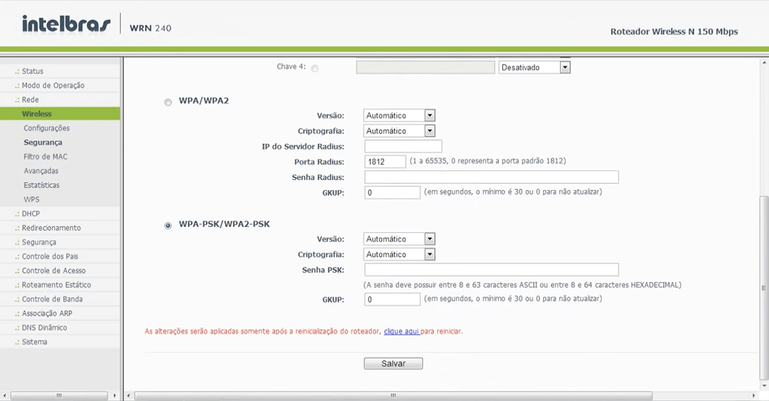 - Enter the Wi-Fi Password in the Senha PSK field and click Salvar.