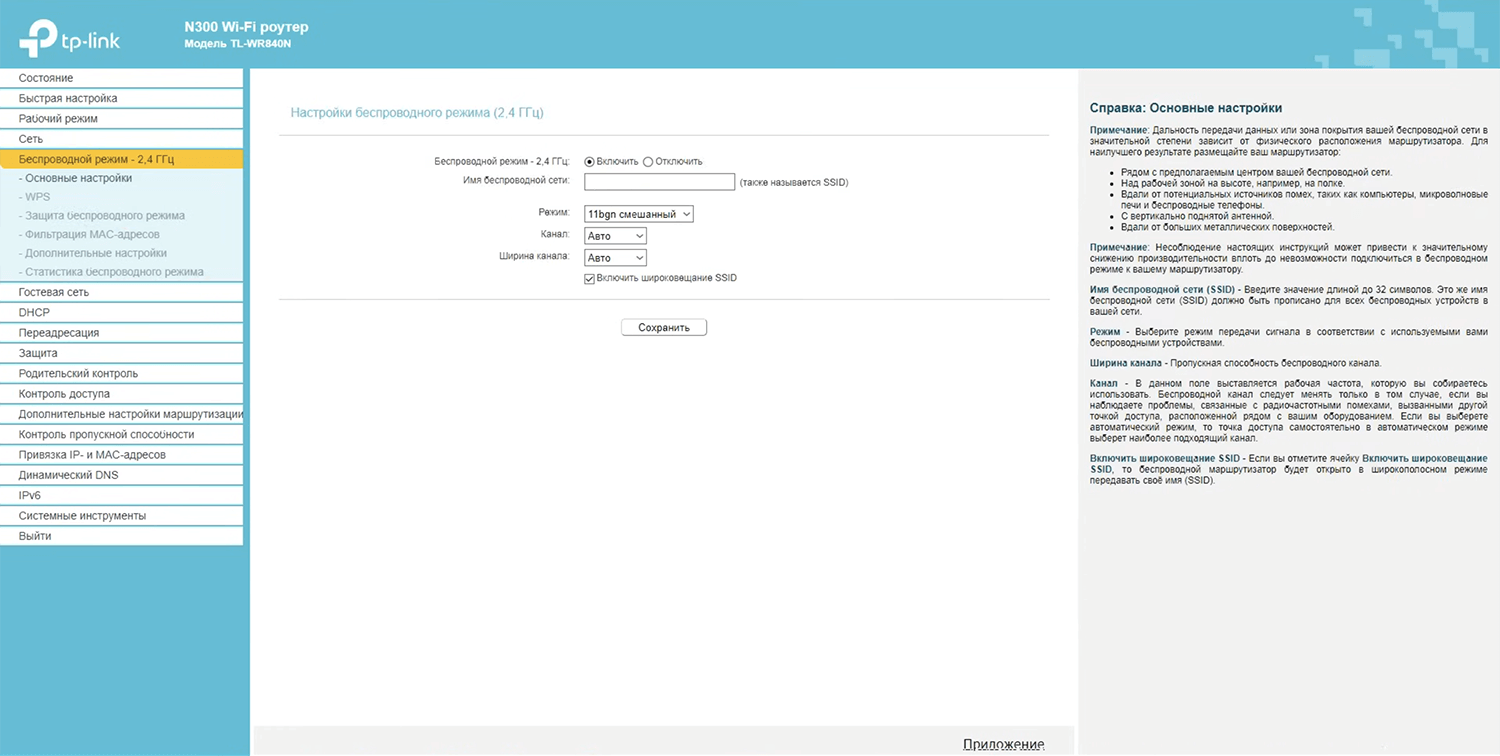 - Select Беспроводной режим – 2,4 ГГц > Основные настройки.