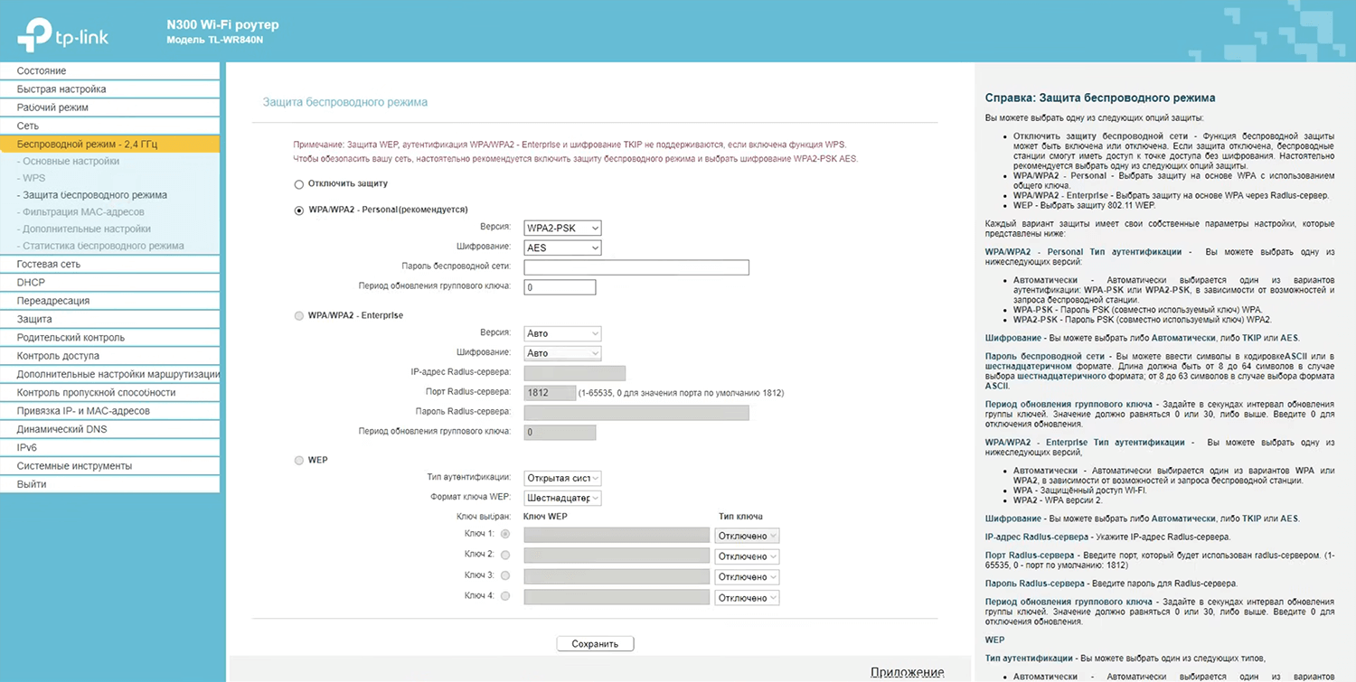 - Select Беспроводной режим – 2,4 ГГц > Защита беспроводного режима.