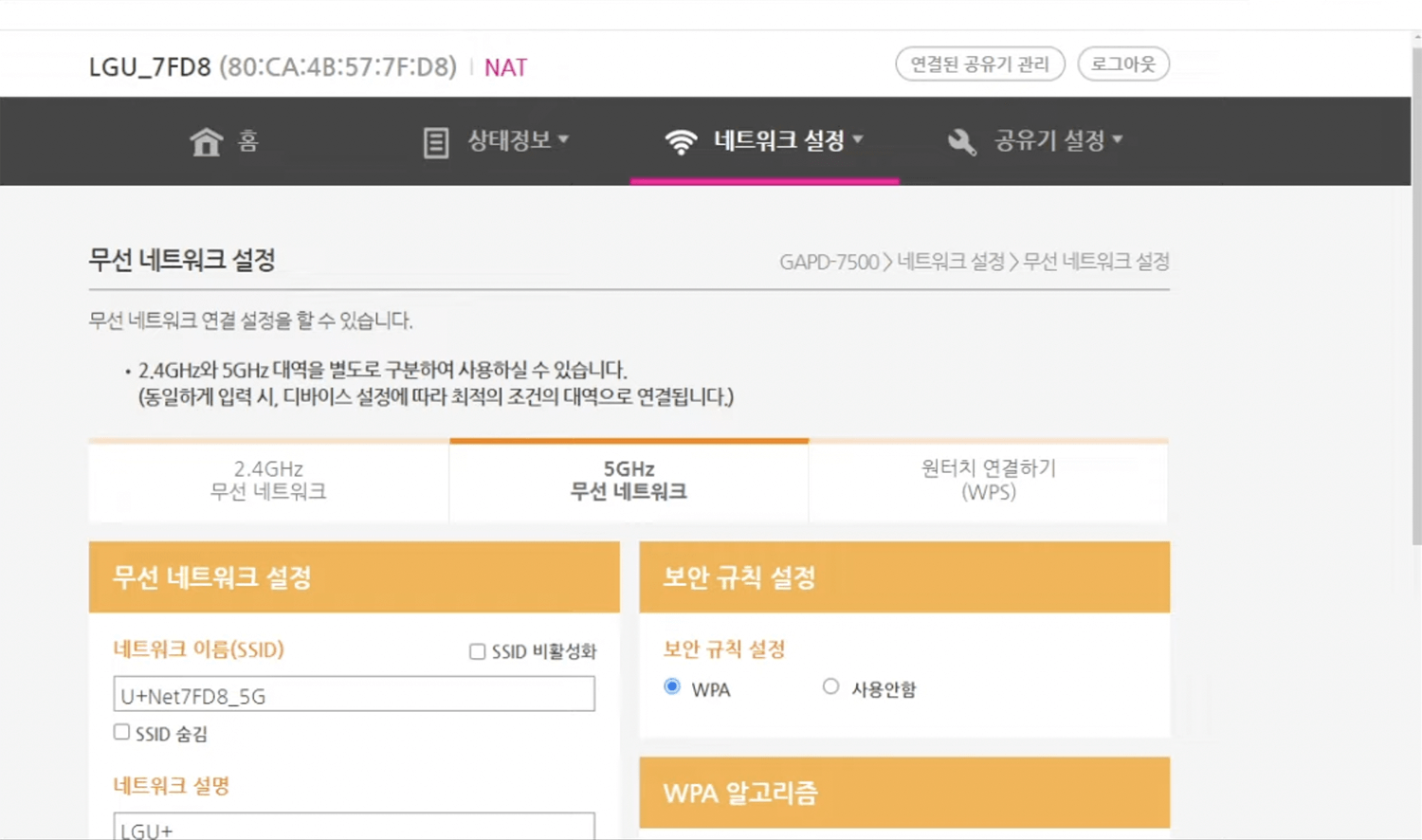 - Select “네트워크 설정” > “무선 네트워크” > “2.4GHz or 5GHz“.