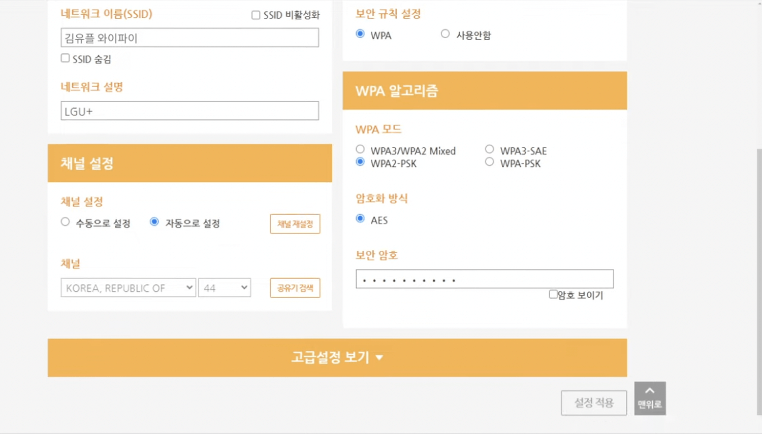 - Enter the Wi-Fi Network Name in the “네트워크 이름(SSID)” field.