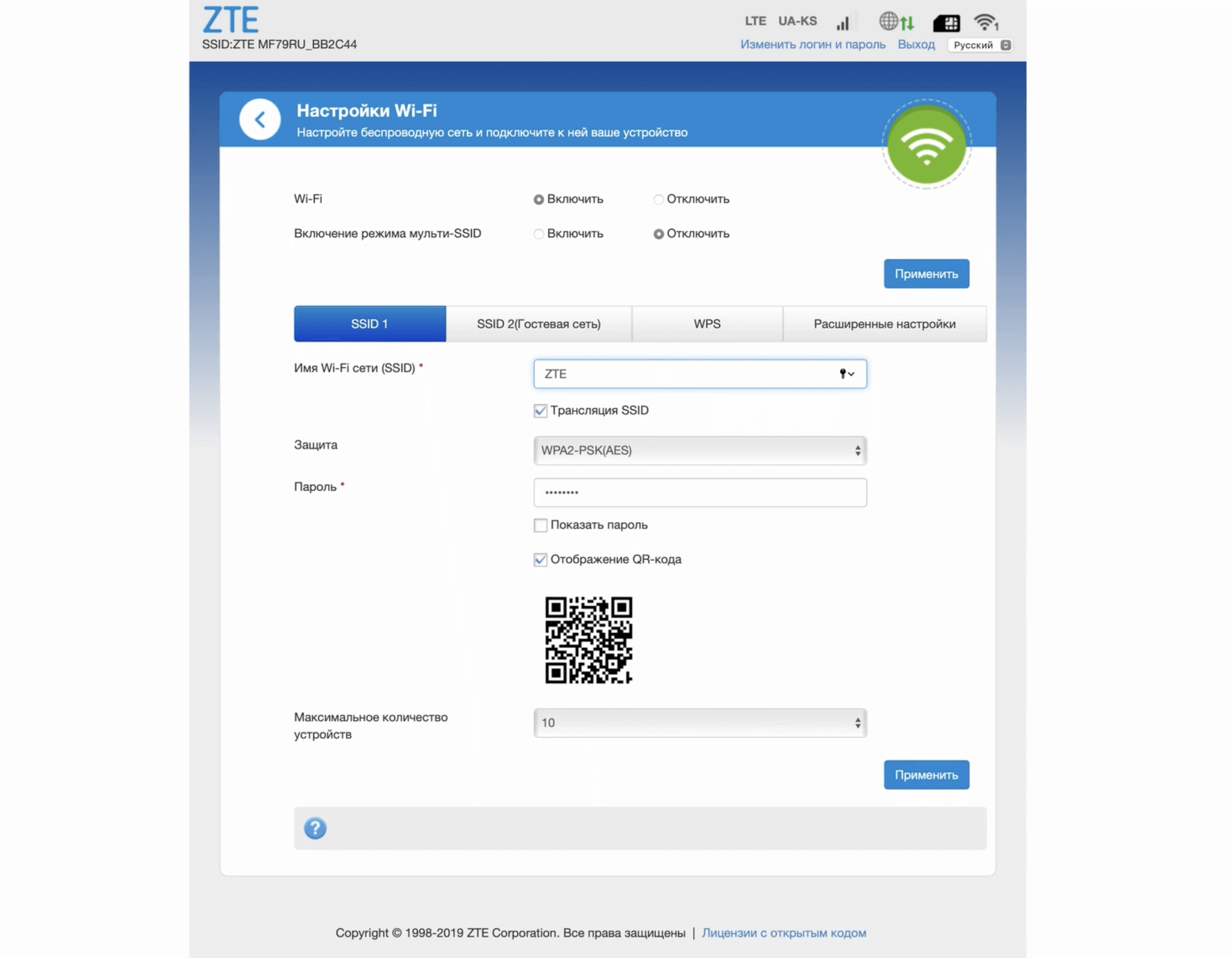 - Select Защита: WPA2-PSK(AES).