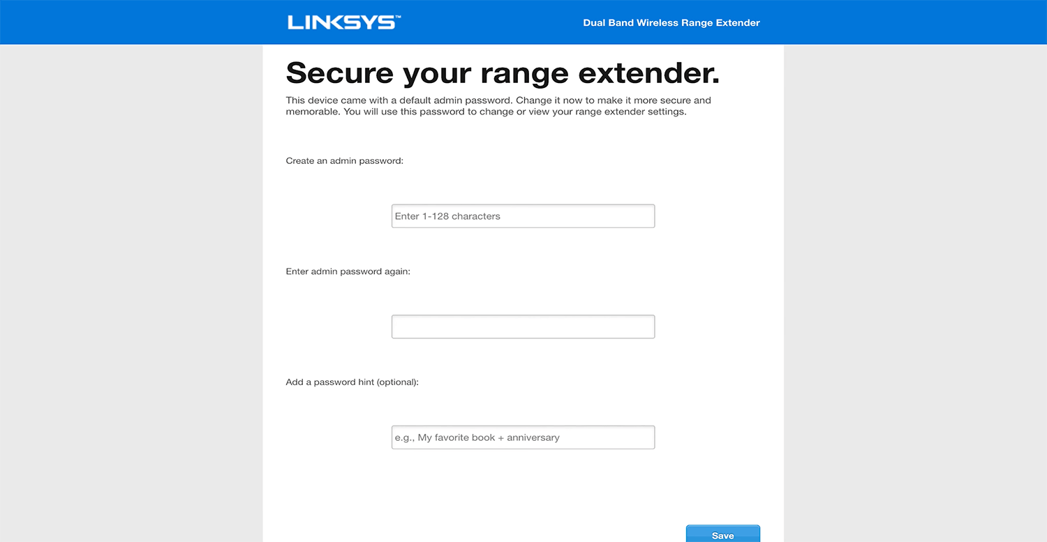 - To secure your range extender, create an admin password. You will use this password to change or view your range extender’s settings.