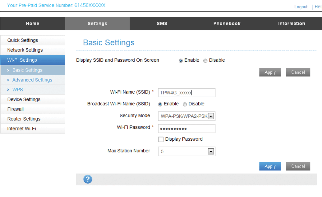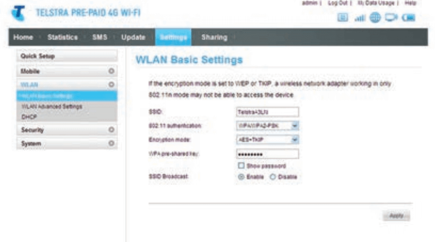 Note: For Telstra Pre-Paid 4GX Hotspot, the Device Password is password.