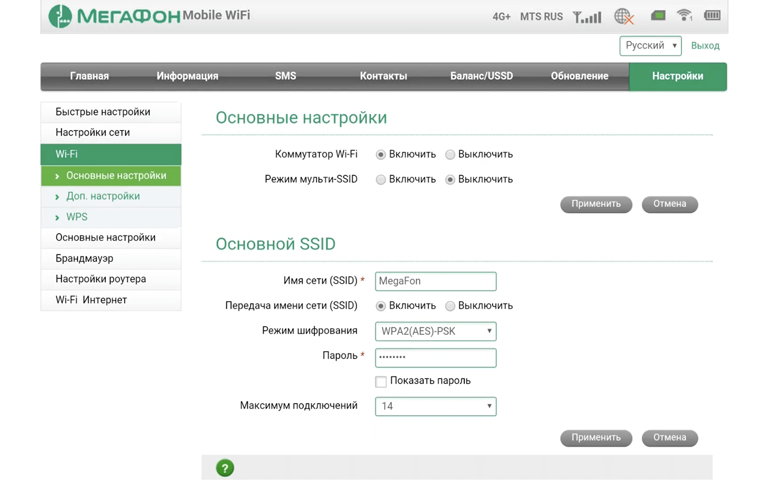 MegaFon web interface allows you to change Wi-Fi password, Network Name (SSID), and default router settings at http://192.168.0.1 or http://192.168.1.1.