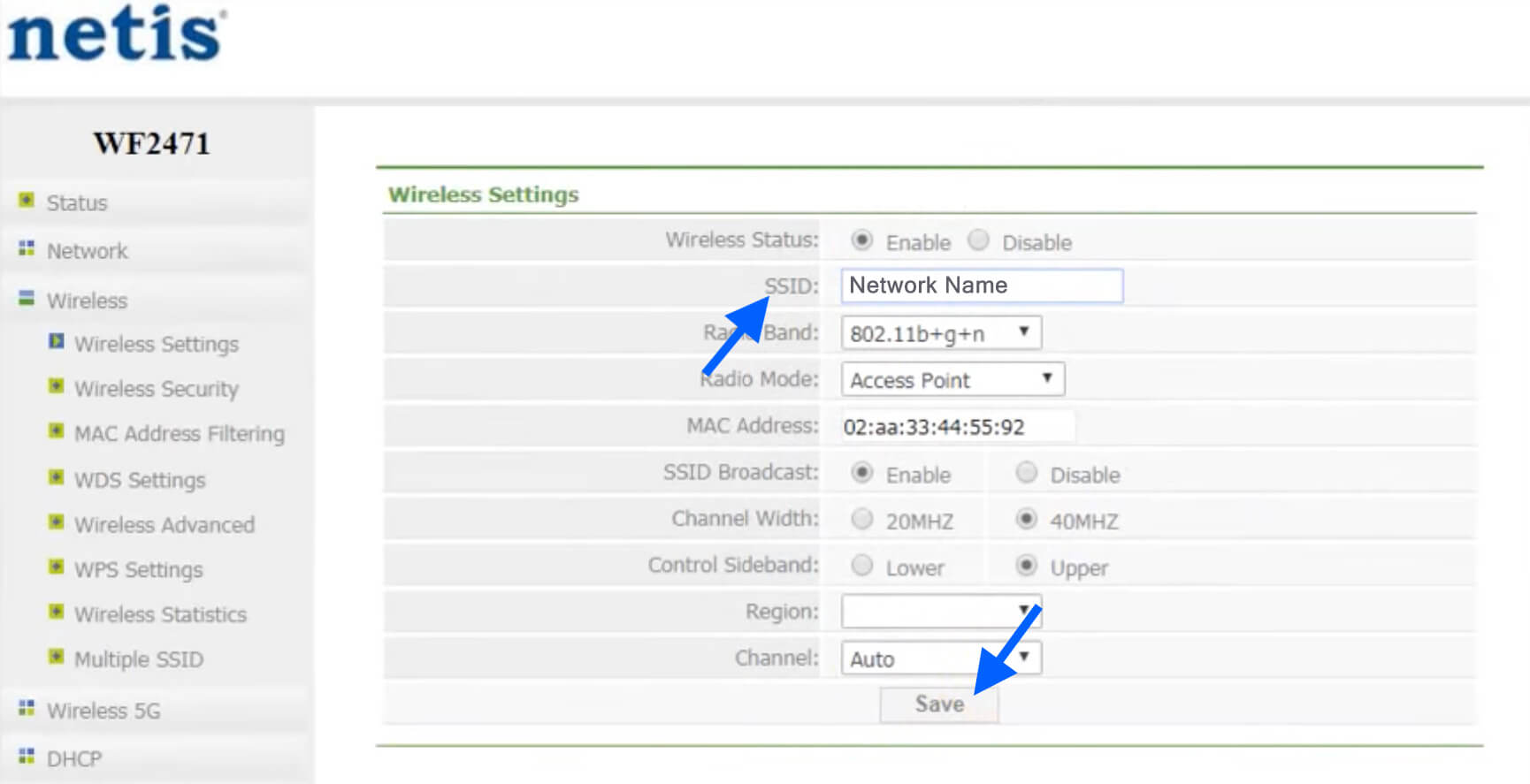 - Once logged in, click on Wireless > Wireless Settings (2.4G) from the left column menu. Optionally, if you want to setup your 5G network, select the Wireless 5G option.