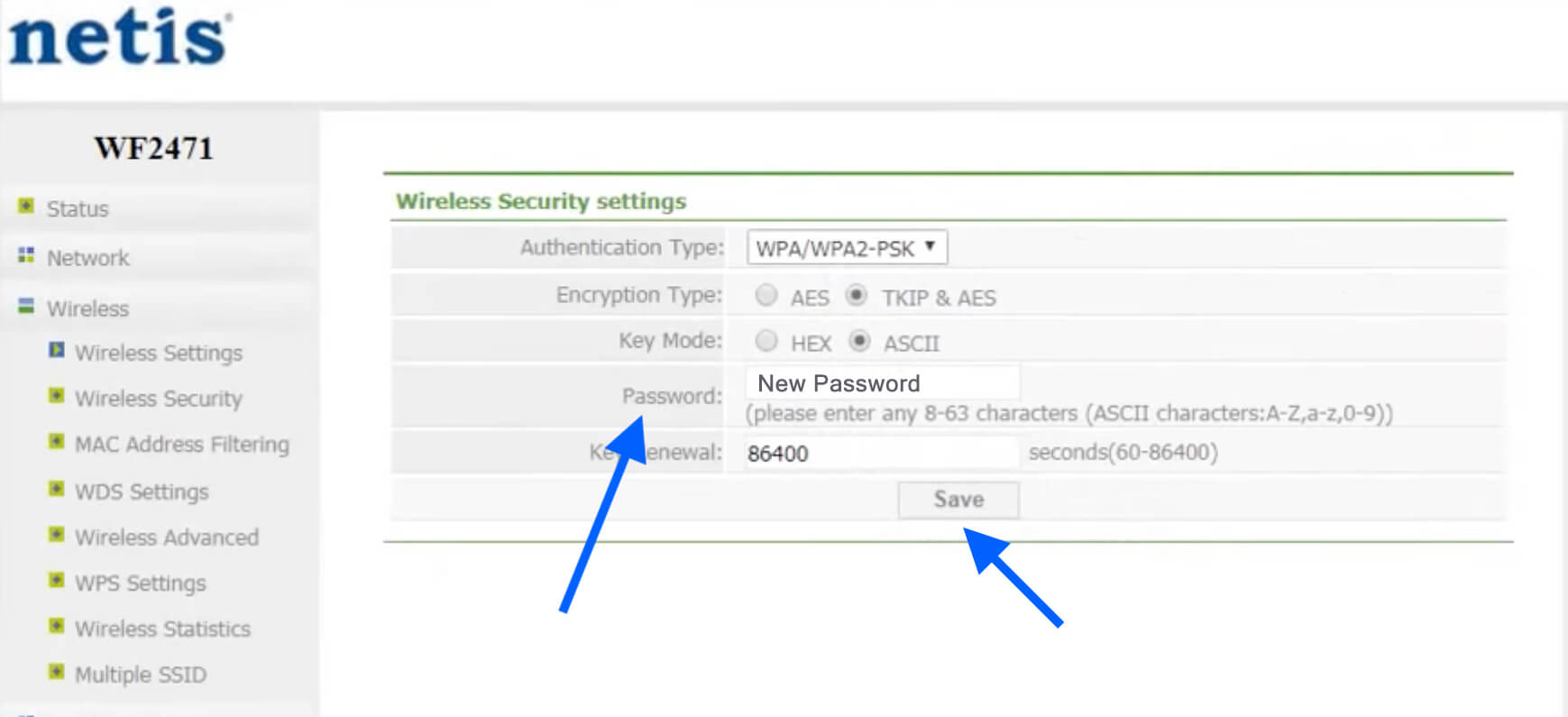 Netis router web interface allows you to change WiFi password, Network Name (SSID), and default settings at http://netis.cc or http://192.168.1.1.