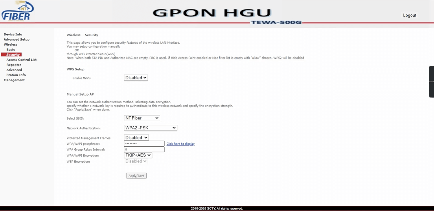 - Enter the Wi-Fi Password in the WPA/WAPI passphrase field and click Apply/Save.
