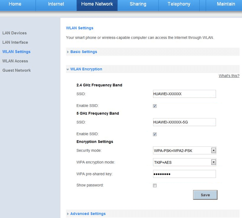- Select Home Network > WLAN Settings > WLAN Encryption.