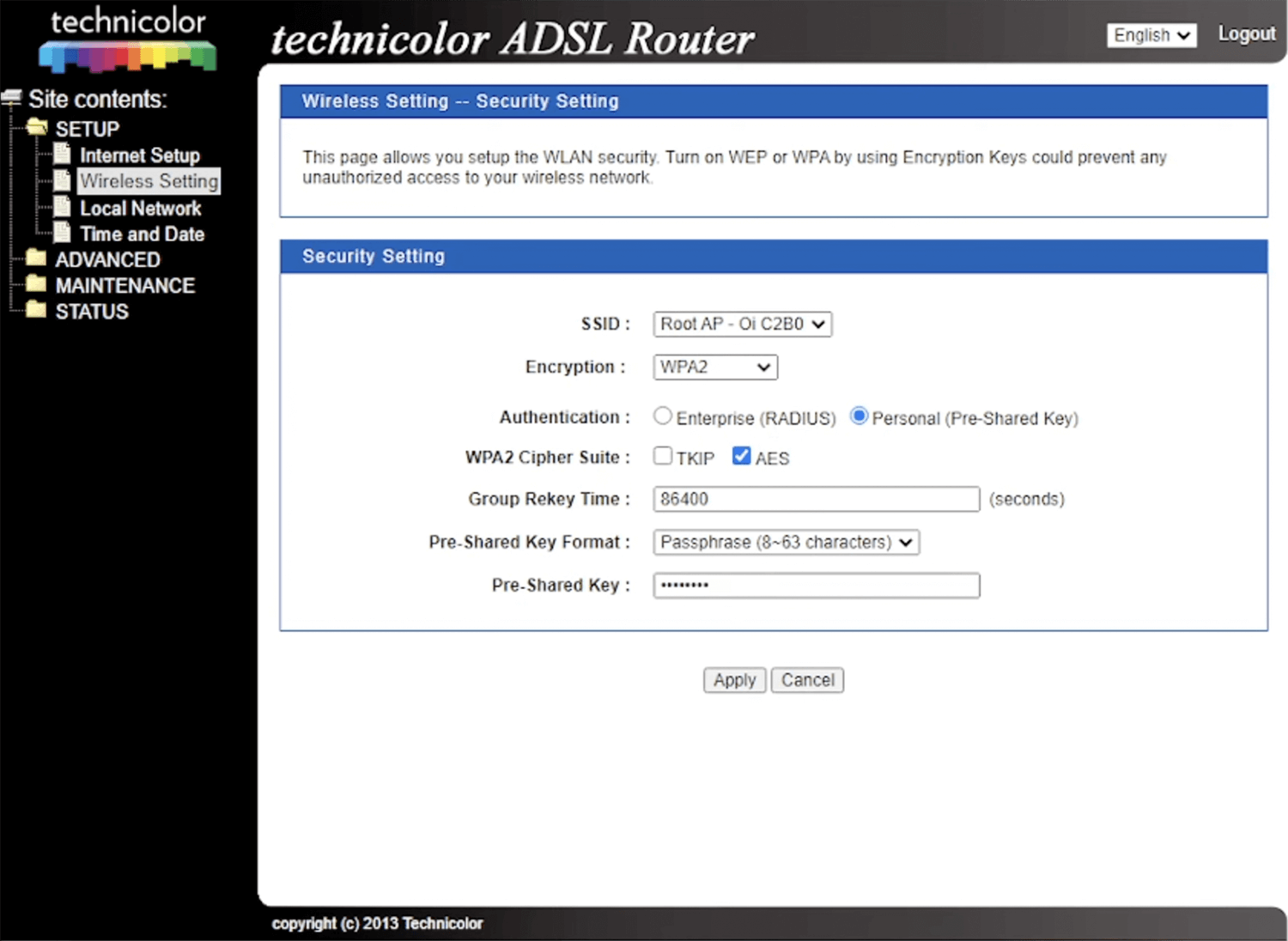 - Enter the Wi-Fi Password in the Pre-Shared Key field and click Apply.