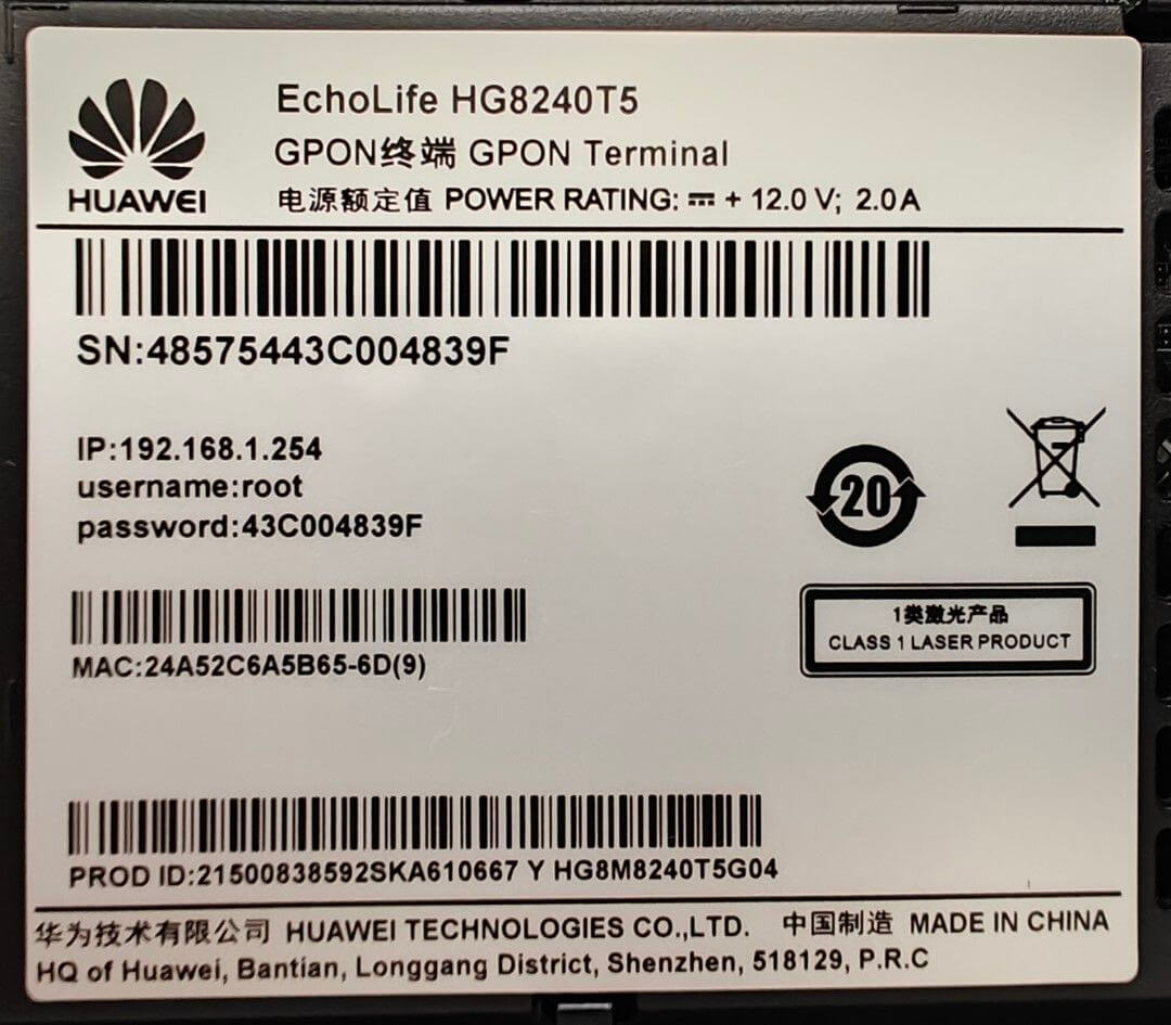 | Huawei HG8240T5 | 192.168.1.254 | root | (Printed on the label) |
