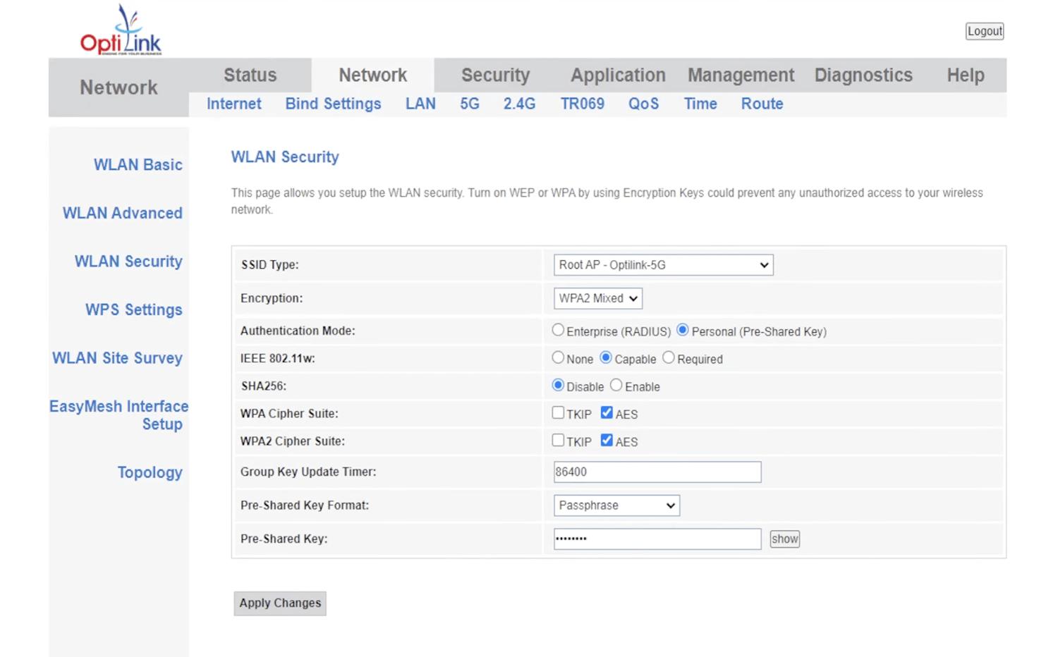 - Enter the Wi-Fi Password in the Pre-Shared Key field and click Apply Changes.
