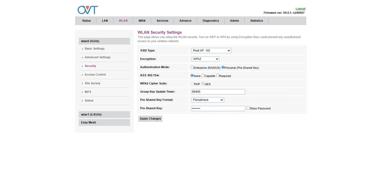 - Go to WLAN > wlan0 (5GHz) or wlan1 (2.4GHz) > Security.