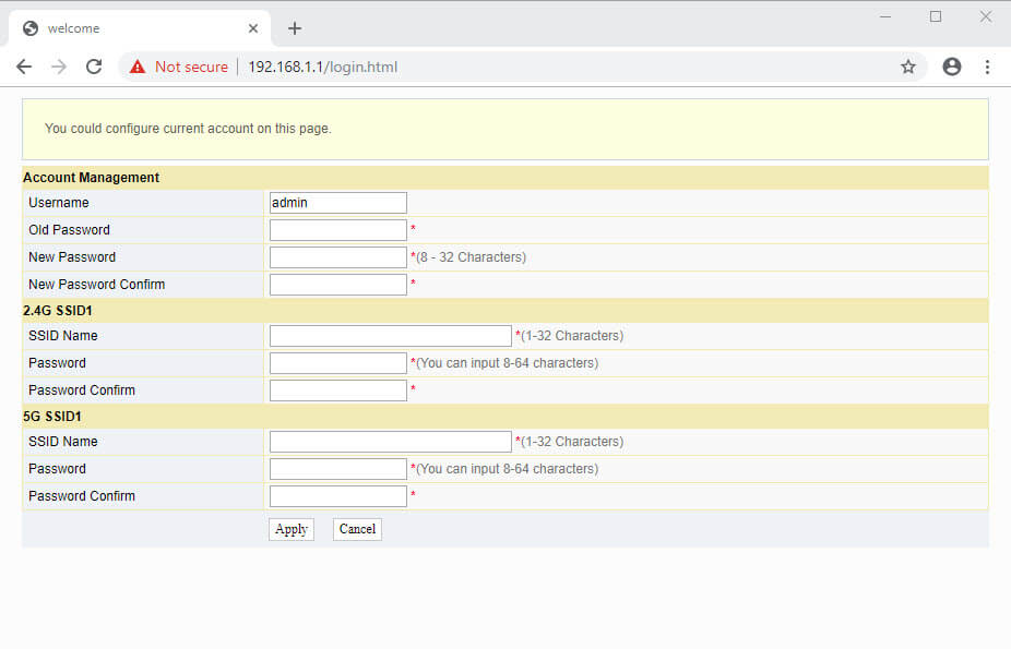 If you are logging into the admin panel for the first time, a prompt will show “Initial login on this account you must modify account password, SSID name and authentication password!” and you will be required to enter Account Management Username and Password, 2.4G SSID1 and 5G SSID1 (optional).