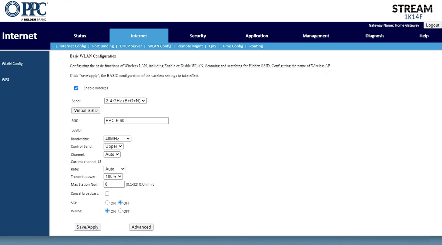 - Select Internet > WLAN Config > Advanced.