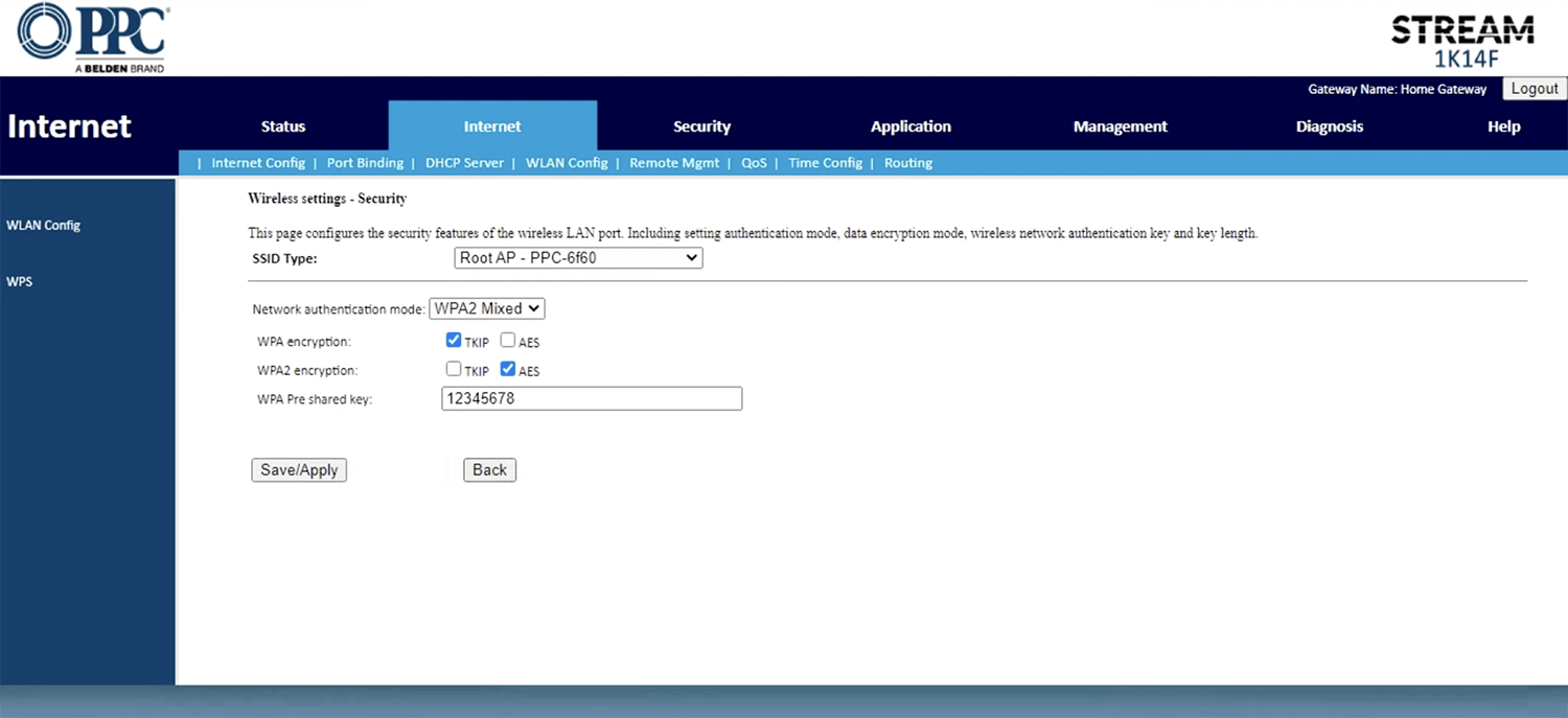 - Enter the Wi-Fi Password in the WPA Pre shared key field and click Save/Apply.