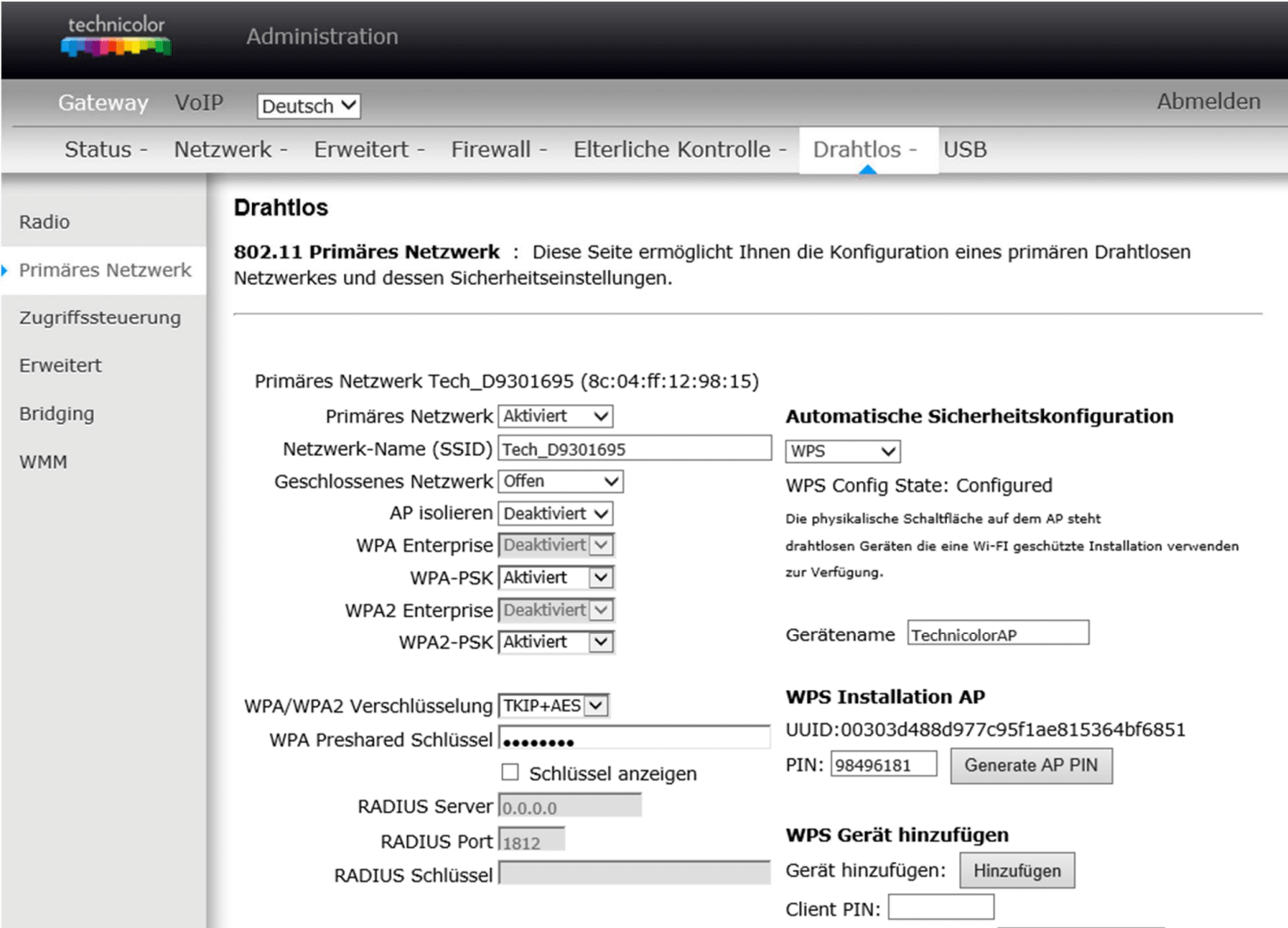 - Enter the Wi-Fi Password in the WPA Preshared Schlüssel field.