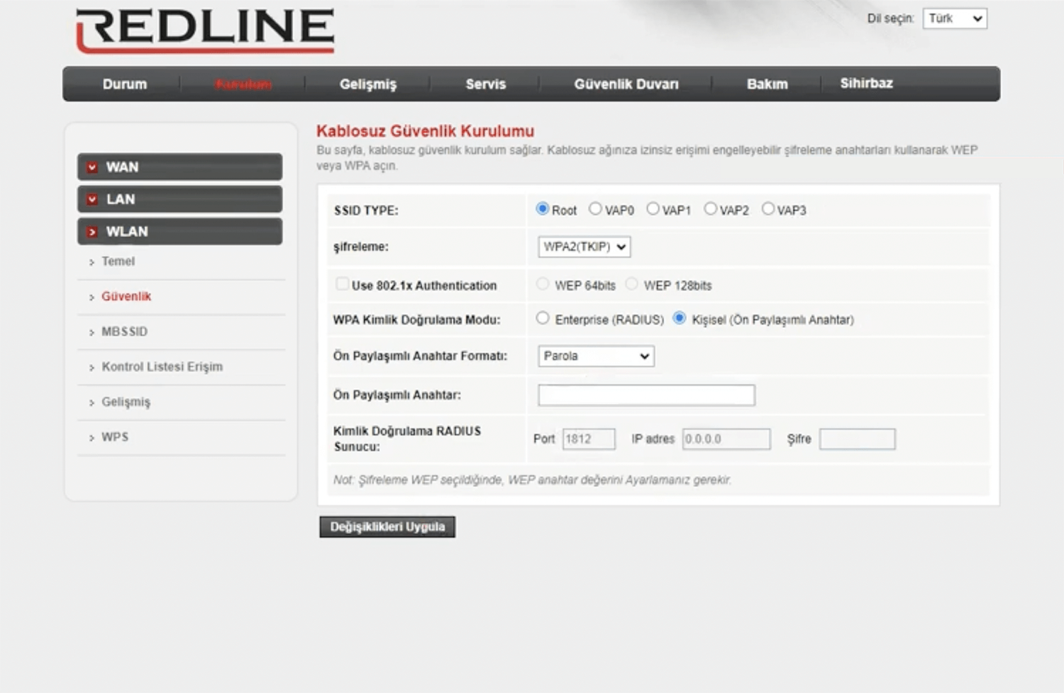 - Enter the Wi-Fi Password in the Ön Paylaşımlı Anahtar field and click Değişiklikleri Uygula.