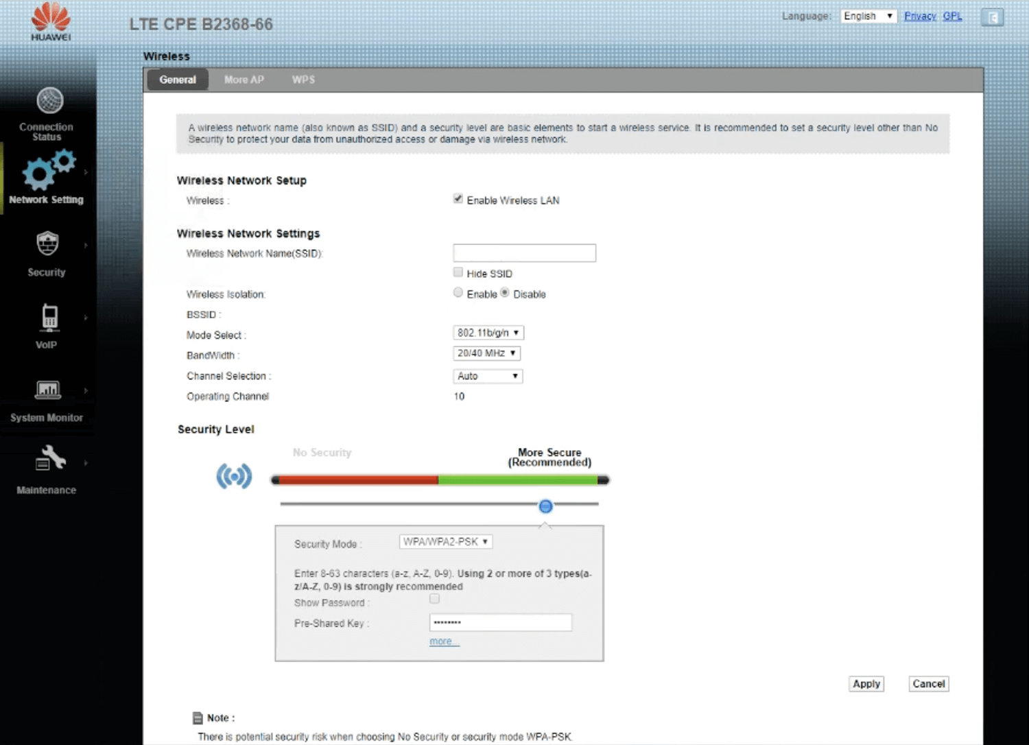 Router Model Username Password Huawei B2368 admin CPE@huawei Huawei B2268H admin LTEcpe - Select Network Setting > Wireless > General.